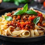 Compared to classic bolognese made with pork and beef, this version is usually lighter because the base is lentils and mushrooms rather than fatty mince. The protein feels steady without that heavy post-dinner slump—especially if you keep your pasta portion around 70–80 g dry weight. Fibre from the lentils and vegetables helps with fullness and just makes the whole plate feel more balanced.