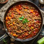 Start by chopping the veg really small—think 3–5 mm dice—so the sauce turns out cohesive, more like a ragù than a chunky stew. While the pan heats over medium, rinse the lentils until the water runs clear; excess starch can make the sauce feel a bit gluey. Keep an eye on moisture: mushrooms release liquid first, and only after that evaporates do you get that proper sautéed, toasty aroma. If you rush and add tomatoes too early, the mushrooms basically boil and the flavour turns flat.