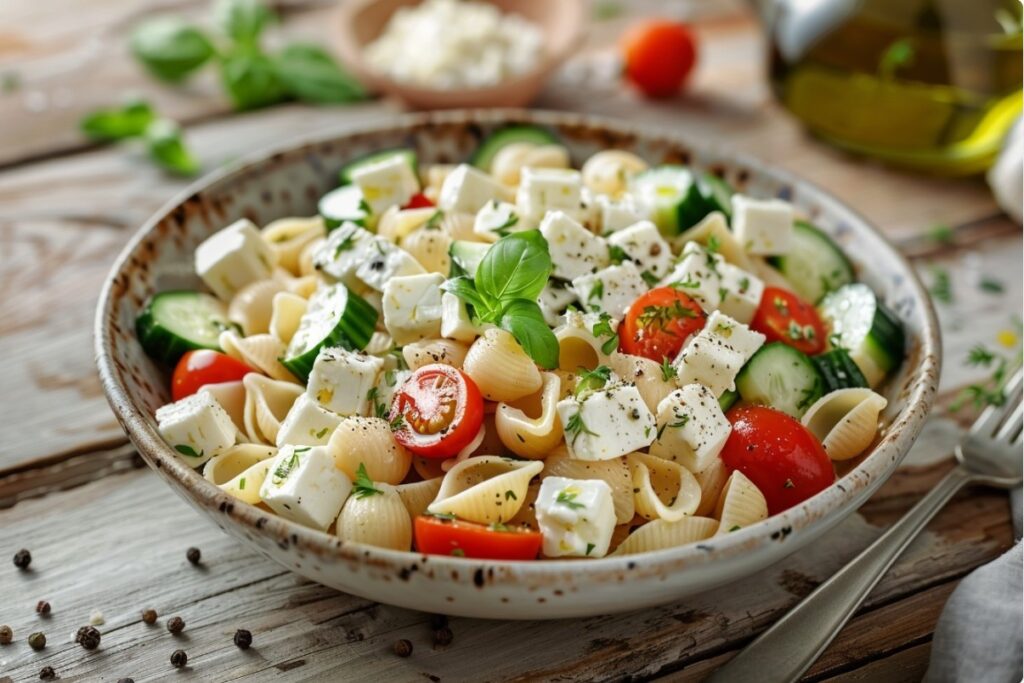 Після першої ложки відчувається прохолода огірка й пружність пасти, без жирної плівки на піднебінні. Лимон і зелень освіжають за 10 хвилин до подачі, коли салат встигає настоятися. Фета додає солонуватий акцент, а овочі дають хрускіт — саме те для літнього меню. І ще одна користь: зручно брати з собою в контейнері, бо заправка не «пливе».
