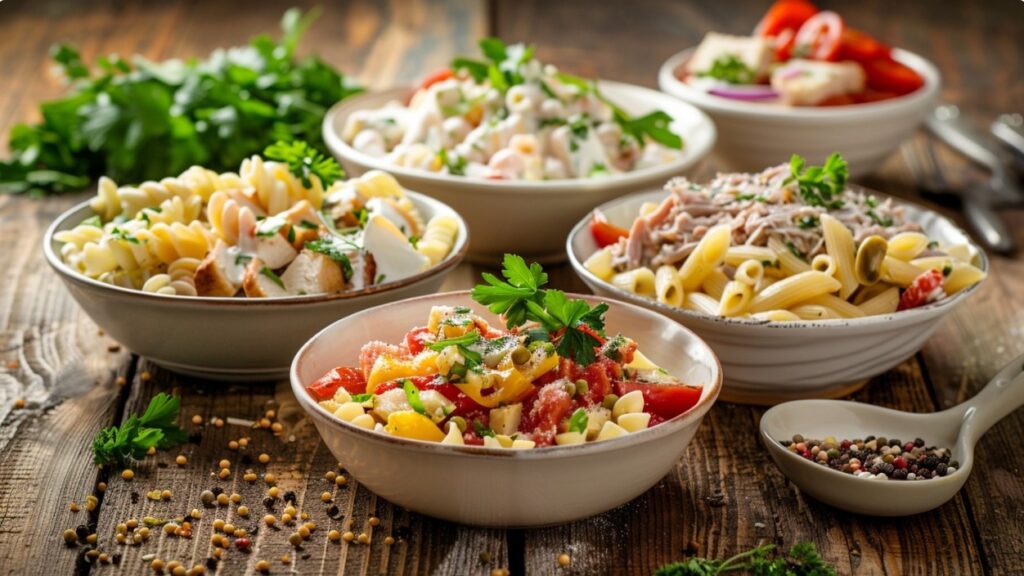Асортимент салатів з макаронами у мисках на дерев’яному столі — класичний салат з макаронами, салат з тунцем, куркою та овочами