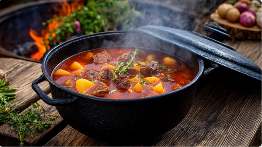 Бограч у казані зазвичай з’являється тоді, коли збирається компанія й хочеться чогось серйознішого за звичайний суп. Він не потребує складних технік, але любить час і спокій.
