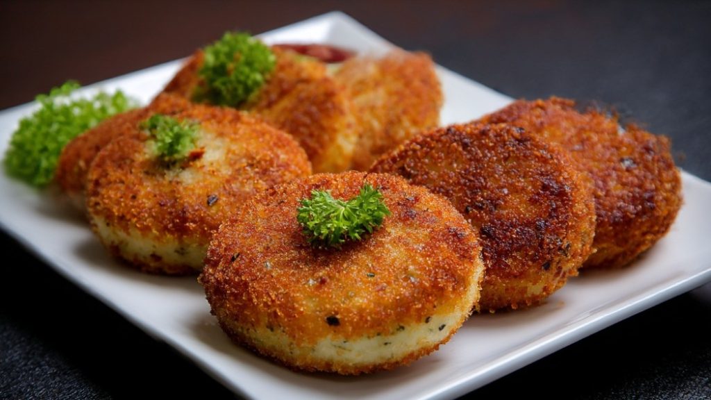 - Сформуйте з картопляної маси невеликі плоскі котлети. Обваляйте в паніровочних сухарях або вборошні